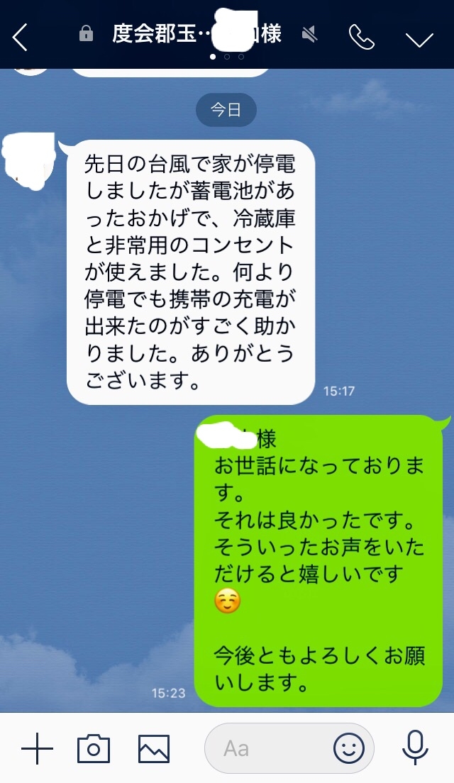 先日の台風21号の影響で停電した地域のお客様より、